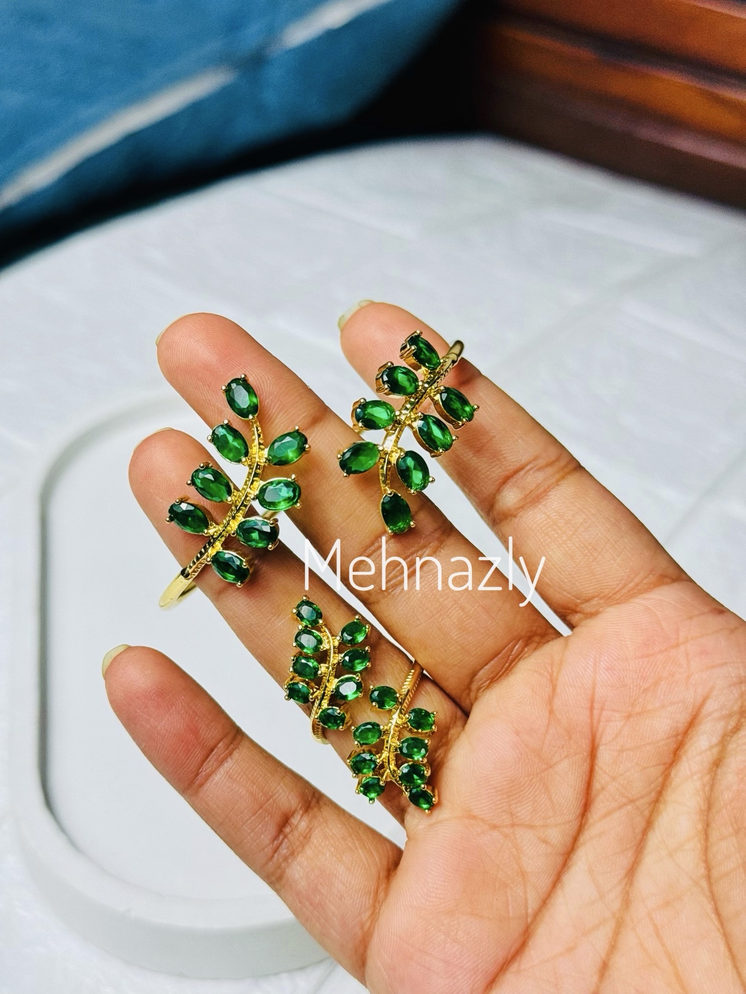 Green leaf design bracelet and ring set. Adjustable